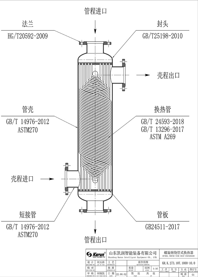 2.非對(duì)稱流設(shè)計(jì):螺旋纏繞管式換熱器管程與殼程容積不相同,殼程容積能達(dá)到管程容積的 4.2 倍,以滿足醫(yī)藥,化工等各種不同復(fù)雜工況要求。